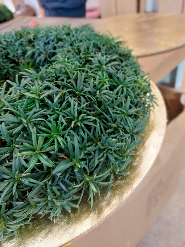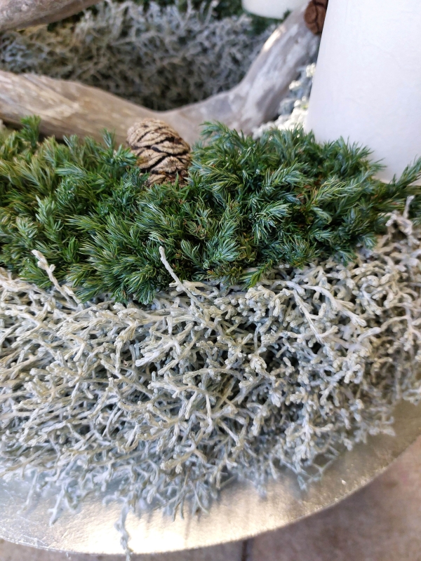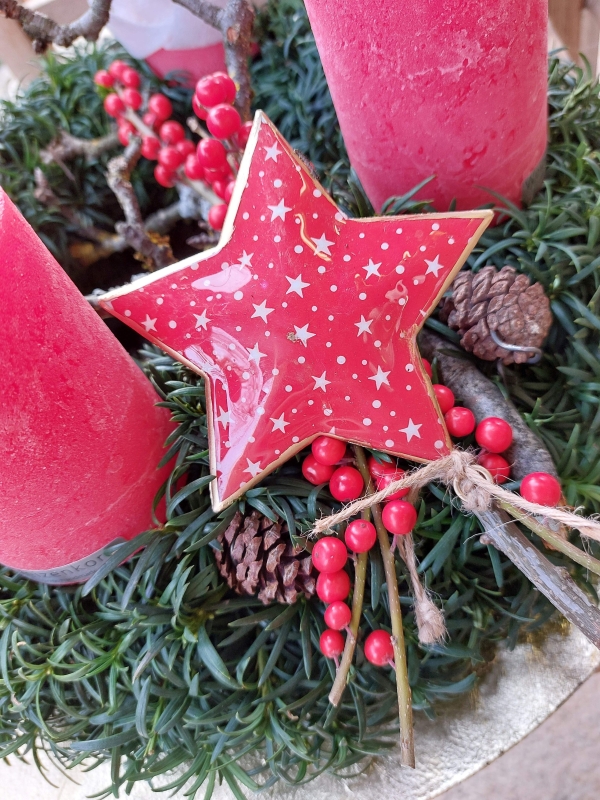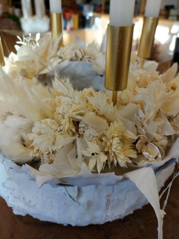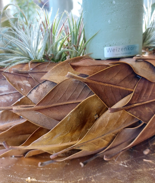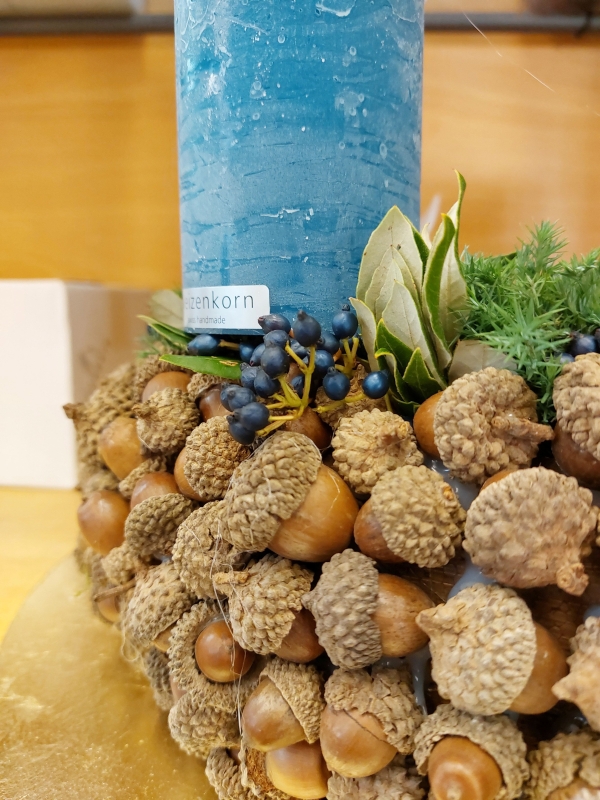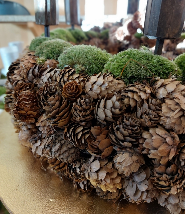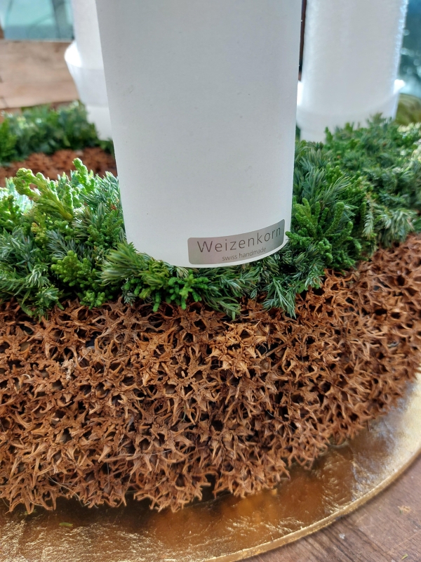 Die fleißigen Hände unseres Hauses verarbeiten derzeit Zapfen, Moos, Eicheln, trockene Bananenblätter, Calocephalus, Walnüsse, und natürlich -ganz klassisch- Taxus u.v.a. zu besonderen Adventskränzen und Gestecken.